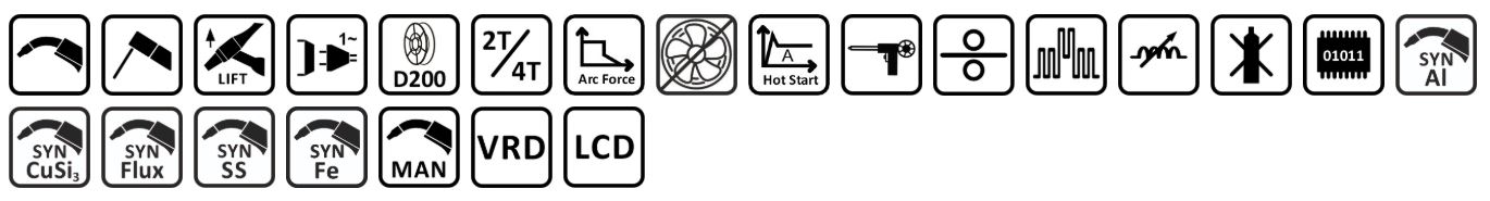 Jellemzők: 2T/4T , Íverő , Ventilátorleállítás , Melegindítás , Mikrokontroller (MCU) , Opcionális tekercses hegesztőpisztolyok , 2 görgős adagoló , Kettős impulzus , MIG gázadagolás , Előtoló megközelítési sebessége , Impulzus MIG , Indukciós feszültségszabályozás, Gázmentes hegesztés , Digitális vezérlés , Synergy szénacél , Kézi beállítás , VRD , Elektródaválasztás , LCD kijelző , Synergy alumínium , Synergy CuSi3 , Synergy önárnyékolt huzal , Synergy rozsdamentes acél.