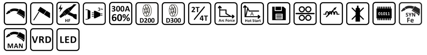 Funkciók: 2T/4T, Arc Force, AC 36V aljzat, melegindítás, mikrovezérlő (MCU), áramrámpa, áramrámpa, beállítási memória, 4-görgős adagoló, MIG gázutóáramlás, TIG gázutóáramlás, gáz előáramlás, impulzusos TIG, indukciós teljesítményszabályozás, gázmentes hegesztés, MIG ponthegesztés, digitális vezérlés, szénacél szinergia, gyors huzaladagolás, huzalvisszaégés, manuális beállítás, VRD, LED kijelző.