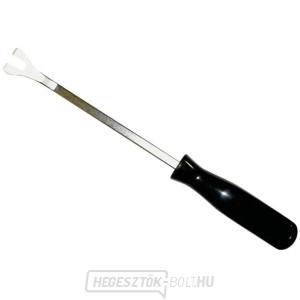 A műanyag ajtókárpit-felszerelések egyszerű eltávolítására szolgáló speciális szerszám egy fogantyúból és egy vödörformájú, villás végű fémrészből áll.