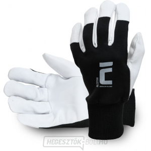 Kesztyű kecskebőrből a tenyéren, pamutszövetből a hátoldalon, átlapolt ujjbegyekkel és egy folt a csuklón. EN388 - Védőkesztyű a mechanikai veszélyek ellen.