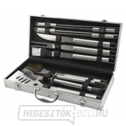 A készlet tartalmaz egy precízen köszörült élű esztergát fogazott pengével, parafanyitóval és lefolyónyílásokkal. Speciálisan kialakított fogók a különféle ételek szilárd megfogására, kefe a grill karbantartásához, ahol maga a kefe rész sárgarézből készült. A grillezőeszköz nélkülözhetetlen része még egy kétágú villa, egy nylon sörtéjű kefe, az ételek dörzsölésére vagy ecsetelésére, egy adagoló kés és 4x éles hegyű grilltű.