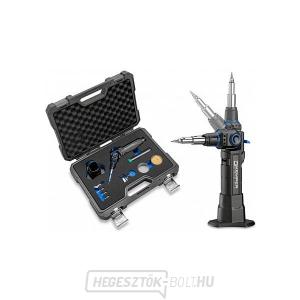 Mini forrasztópáka/pisztoly állítható heggyel, piezo gyújtással, katalitikus késsel, zsugorterelővel, hőlégfúvókával, késrel, forrasztócsúccsal, bádoghuzal, tisztító szivacs, állvány, tok. 10051 vagy BF55 kazettából származó bután gázzal újratölthető.