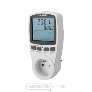 Az energiafogyasztásmérő egy többfunkciós mérőeszköz, amely a bemeneti teljesítmény, áram, feszültség, frekvencia, teljesítménytényező és villamosenergia-fogyasztás mérésére szolgál. energia. A készülék megjeleníti az aktuális és maximális bemeneti és áramerősséget. A nagyméretű kijelző a csatlakoztatott elektromos készülék áramfogyasztásának napi/heti/havi előzményét mutatja be, és az energiafogyasztást mutatja. Az e árának megadása után. energia számolja a működésének költségeit is, esetleg a szénlábnyomot. A nagyon változó működésű készülékeket (pl. hűtőszekrény) az átlagos fogyasztás meghatározásához hosszabb ideig a mérőóra csatlakoztatva kell hagyni. Ha tartalék forrást, például erőművet, töltőállomást stb. tervez vásárolni, egy mérőműszer segítségével meghatározhatja az összes készülékéhez szükséges maximális teljesítményt. Az értékek kijelzőről való leolvasását megkönnyíti a nagy számok és a kijelző háttérvilágítása, amely a gomb megnyomására bekapcsol. Az újratölthető akkumulátornak köszönhetően a mért értékek a készülék aljzatból való kivétele után is leolvashatók.