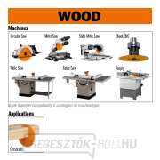 • Felhasználás: Keresztvágásra és tökéletes felületre alkalmas. • Gépek: asztali, gérvágó és körfűrészek. • Anyaga: puha, kemény és egzotikus fa, fa alapú táblák, furnér, papír alapú táblák.